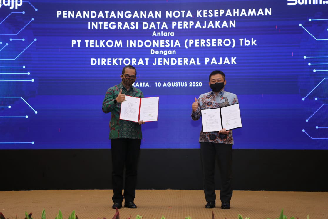 Jakarta, 10 Agustus 2020 – Suryo Utomo, Direktur Jenderal Pajak, dan Ririek Adriansyah, Direktur Utama PT Telkom Indonesia (Persero) Tbk (Telkom) hari ini telah menandatangani nota kesepahaman tentang integrasi data perpajakan. Penandatanganan nota kesepahaman yang dilaksanakan di Kantor Pusat DJP, Jakarta ini merupakan kelanjutan dari program integrasi data perpajakan yang telah diimplementasikan melalui e-Faktur host-to-host sejak 1 Desember 2018.