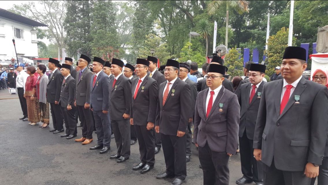 Jajaran Penerima Tanda Kehormatan Satyalancana setelah prosesi penganugerahan saat upacara Peringatan Hari Bhakti Postel ke-72 Tahun 2017 di Bandung, Rabu (27/9). Tanda Kehormatan Satyalancana diberikan kepada WNI yang berjasa memberikan dharma baktinya yang besar kepada negara baik dalam industri Pos dan Telekomunikasi maupun dalam hal umum yang dapat dijadikan teladan bagi orang lain.