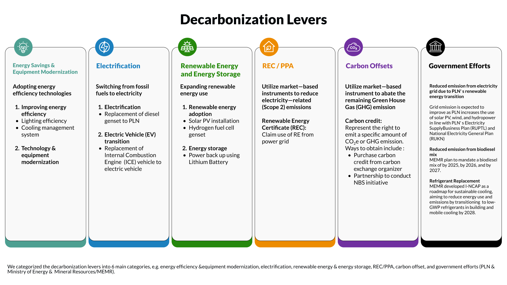 Telkom has developed a sustainability and emission reduction strategy based on six decarbonization levers. The initiatives begin with energy savings and equipment modernization, including improving lighting efficiency, enhancing the cooling management system, and upgrading technology to boost operational efficiency.