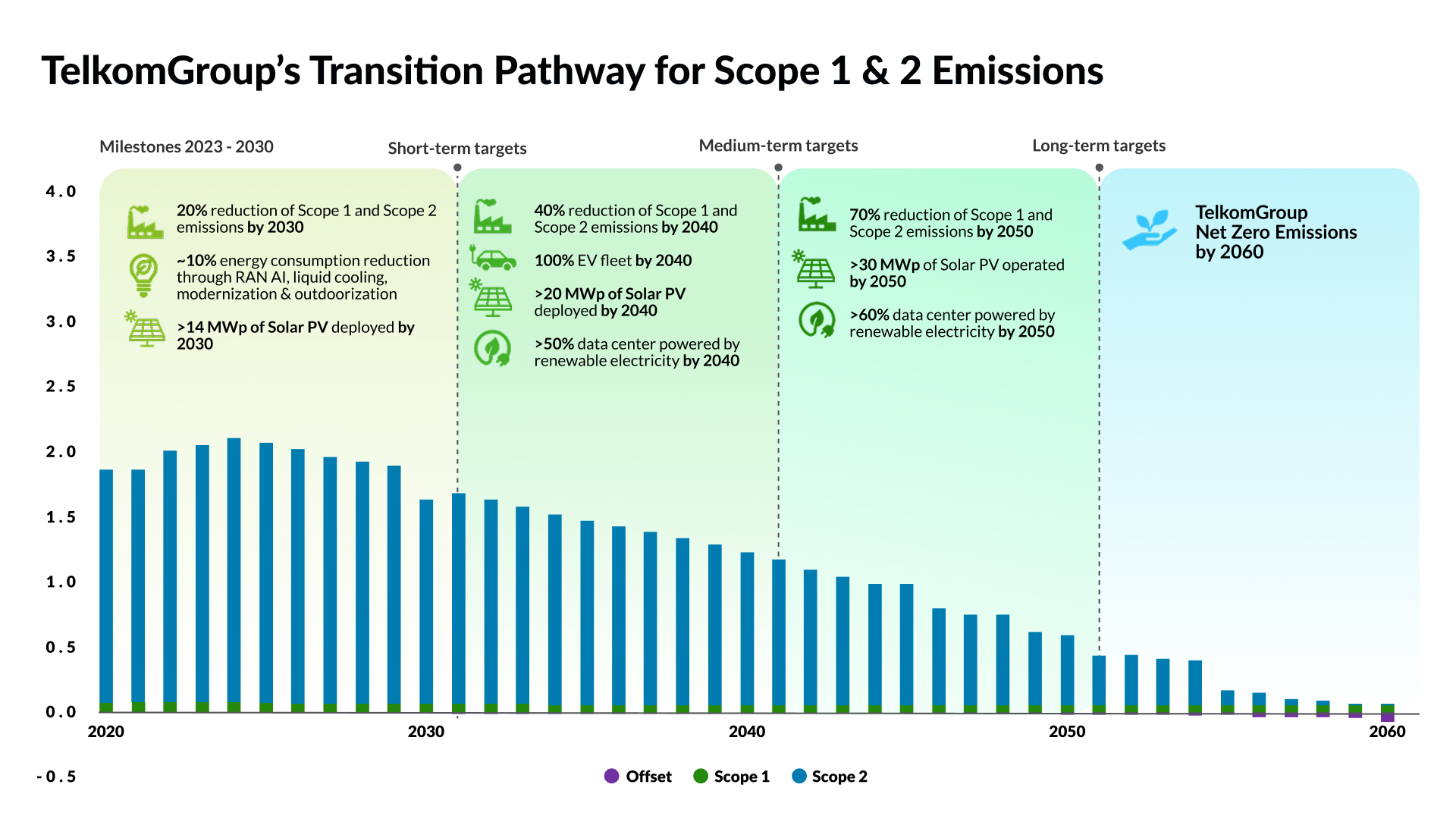 The six levers are translated into a Transition Pathway that outlines TelkomGroup’s journey to reducing Scope 1 and Scope 2 emissions and achieving Net Zero Emissions by 2060. This transition pathway is structured into three timeframes: the short term (2023-2030), the medium term (2030-2050), and the long term (up to 2060).