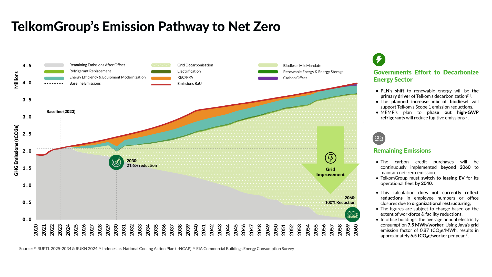 Toward 2060, all these initiatives lead TelkomGroup to achieve a 100% reduction in emissions, with carbon offsets used only for residual emissions that cannot be technically eliminated. These residual emissions will continue to be managed even beyond 2060 to maintain net-zero status. The graphic underscores TelkomGroup’s commitment to a comprehensive decarbonization journey driven by technology, government policy, and sustainable operational transformation.