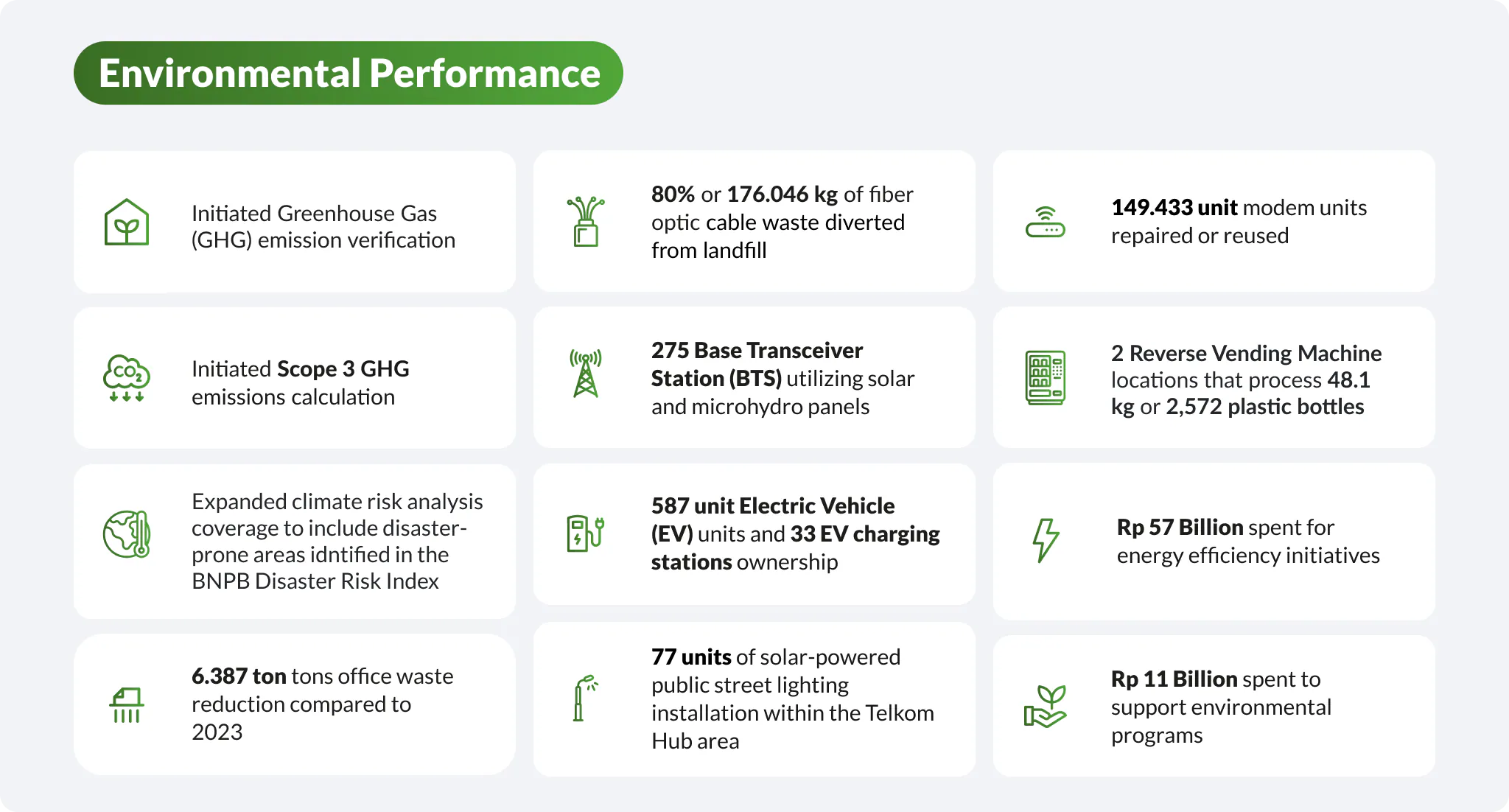 These efforts are strengthened through electrification, such as replacing diesel gensets with PLN electricity and transitioning ICE vehicles to electric vehicles. Telkom also expands clean energy use through solar PV installation, hydrogen fuel cell gensets, and lithium battery energy storage.