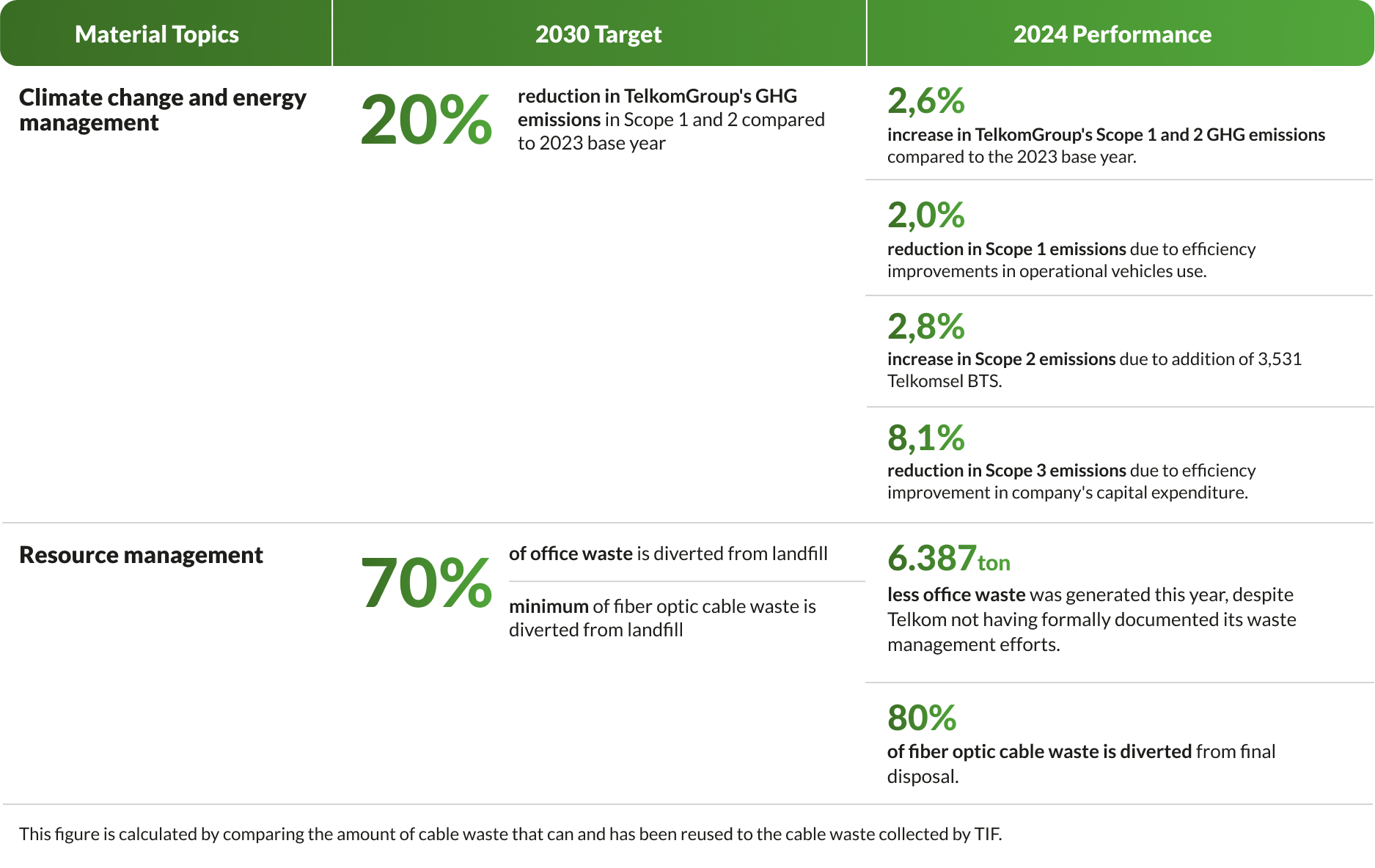One of the wastes generated by TelkomGroup's operational activities is fiber optic cable waste. Telkom targets a minimum of 70% of fiber optic cable waste to be diverted from final disposal by 2030. Until 2024, it is recorded that the amount of fiber optic cable waste diverted from final disposal by TIF is 176,046 kg or 80% of the total cable waste. This figure is calculated by comparing the amount of cable waste that can and has been reused to the cable waste collected by TIF.